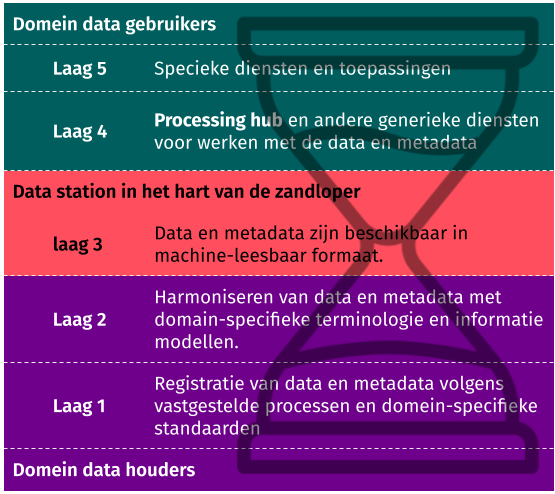 Laag 3 is het hart van de zandloper en fungeert als een brug tussen de twee onderste en twee bovenste lagen. In deze laag worden de data en metadata (1) klaargezet voor gebruik en FAIRificatie proces en (2) verbonden aan het netwerk van beveiligde verwerkingsomgevingen. Deze laag is het meest cruciale om interoperabiliteit te realiseren. Daarvoor wordt een set van minimale, open en technologie-neutrale standaarden gedefinieerd. Het feit dat de data beschikbaar is gemaakt wil overigens niet zeggen dat het ‘zomaar’ wordt vrijgegeven. Voor elke datagebruiker zal speficiek worden bepaalt welke subset van data beschikbaar wordt gesteld.